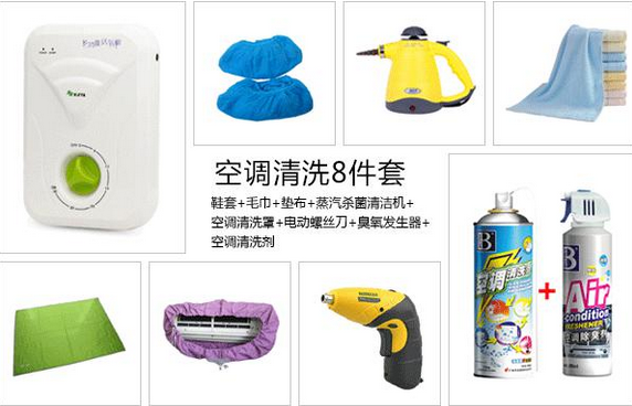 空調(diào)清洗8件套,包括:鞋套、毛巾、墊布、蒸汽殺菌清潔機(jī)、空調(diào)清洗罩、電動(dòng)螺絲刀、臭氧發(fā)生器和空調(diào)清洗劑。